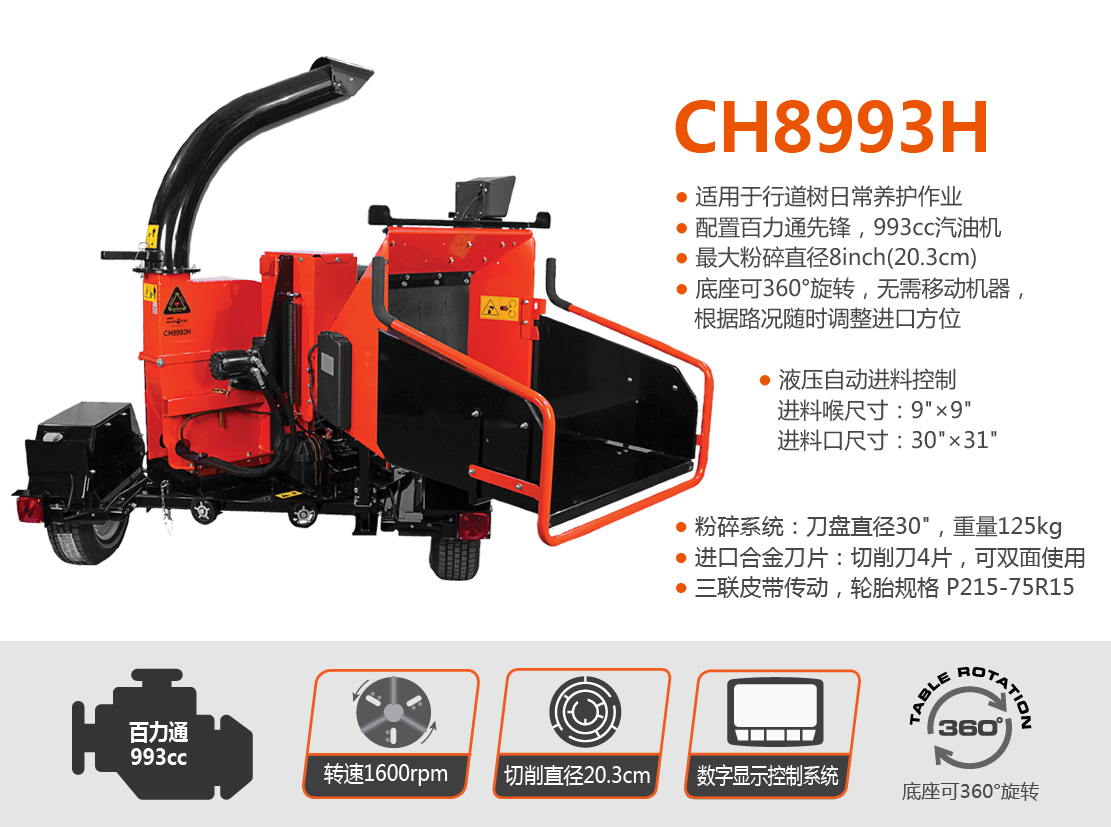 老熊(BEARCAT)品牌樹(shù)枝粉碎機(jī),配置百力通先鋒993cc發(fā)動(dòng)機(jī),最大可切削直徑20cm樹(shù)枝。